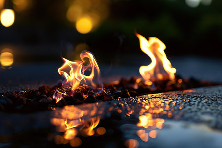 Bright orange flames burning on wet asphalt at night, creating a dramatic and vibrant contrast against the dark background with bokeh effect