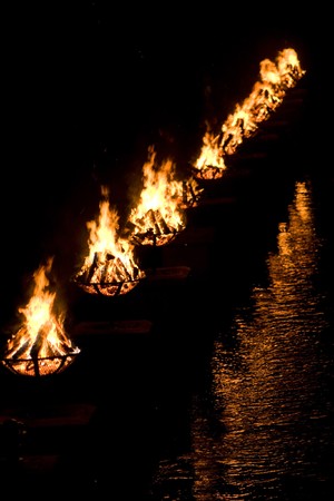 A shot of the burning bowls of fire set on the river during the annual WaterFire event in Providence, Rhode Island.
