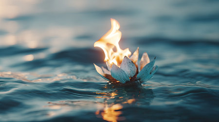 A close-up view presents a lotus flower constructed with delicate petals, alight with flames. The flower floats upon serene blue water, reflecting light and creating contrast. The composition highlights the fiery core, suggesting themes of transformation and spirituality. Suitable for conceptual illustrations and editorial projects.