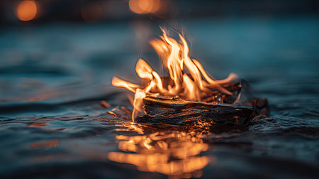 An image showcases a burning flame floating on water. The scene displays warm orange and yellow hues of the fire contrasted against cool blues and greens of the water. The composition focuses on the interplay of fire and water, with soft lighting and a blurred background, suggesting a natural environment. Suitable for conceptual illustrations or editorial uses.