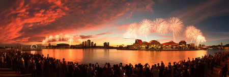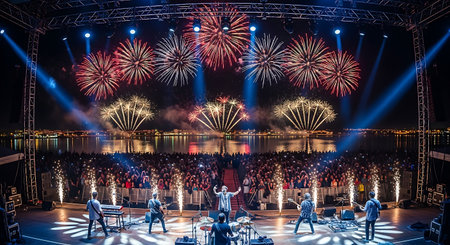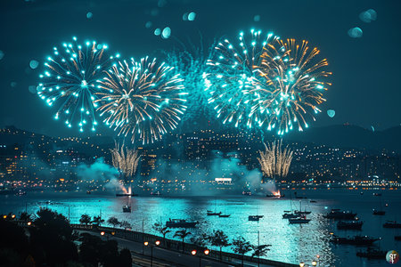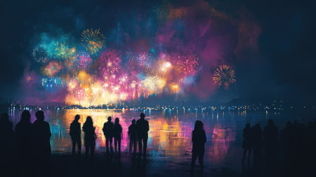A breathtaking display of vibrant fireworks bursts over tranquil waters, creating stunning reflections. The scene captures the essence of celebration and joy.