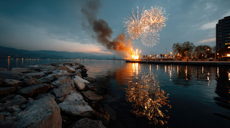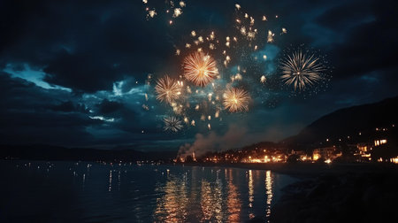 Stunning fireworks light up the sky over a coastal town, celebrating with room for text