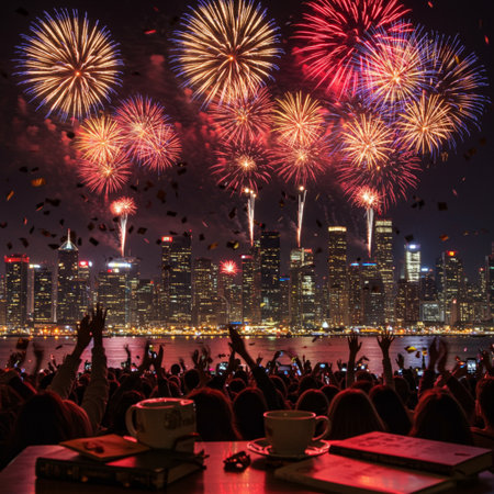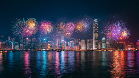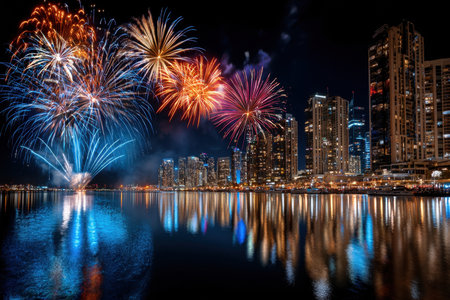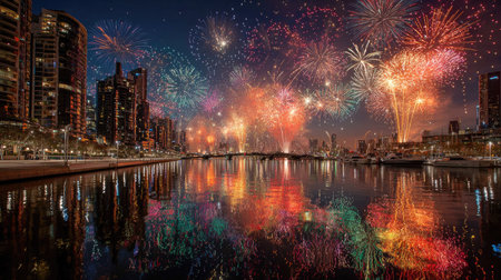 A stunning display of colorful fireworks illuminates the night sky over a vibrant city skyline. Reflections in the water create a mesmerizing atmosphere of celebration and joy.