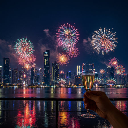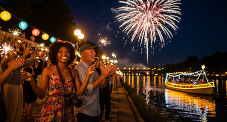 Bright fireworks burst into vivid colors over the river, reflecting in the water as the city's skyline glows at night, creating an enchanting festive ambiance.