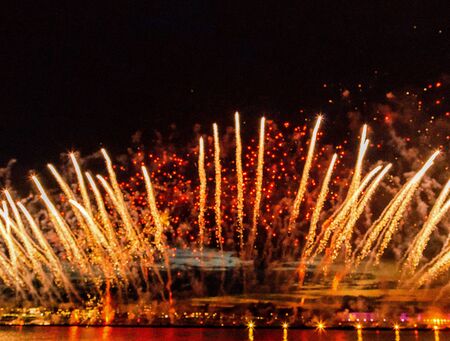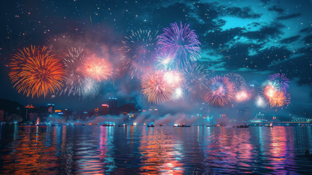 Breathtaking display of colorful fireworks over water at night, creating a stunning reflection. Perfect for celebrating events and festivities.