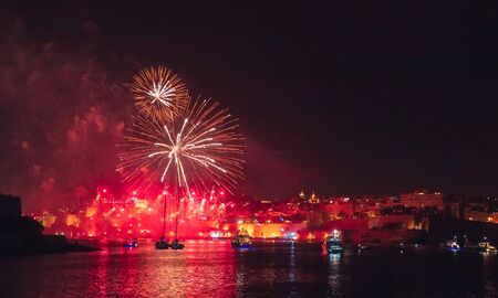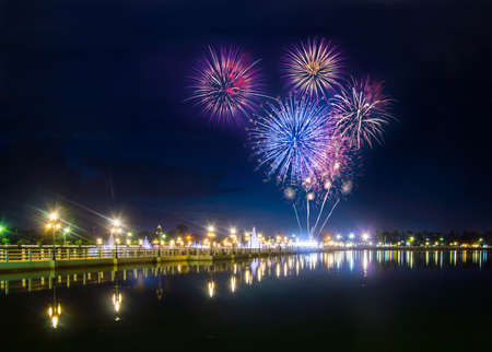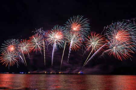 Amazing beautiful colorful fireworks display on celebration night, showing on the sea beach with multi color of reflection on water