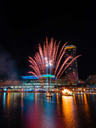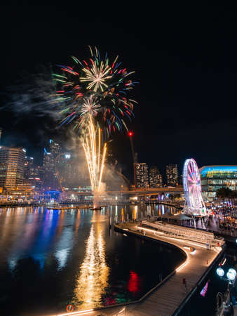 Sydney, Australia - June 11, 2021: Colorful fireworks at Darling Harbour for Sydney Solstice Festival.