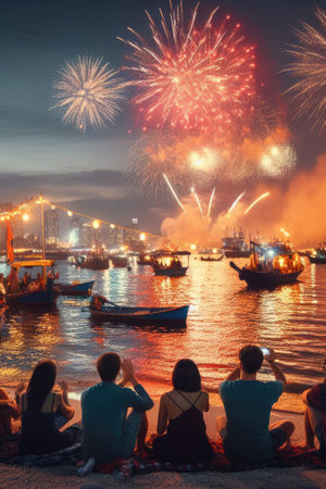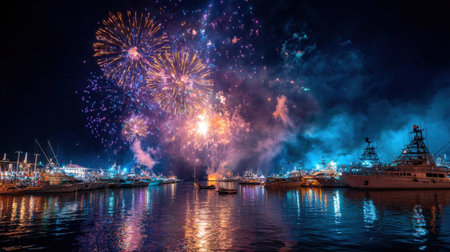 Enjoy a breathtaking view of a vibrant fireworks display illuminating a harbor at night. Colorful lights reflect off calm waters, enriching the festive atmosphere.