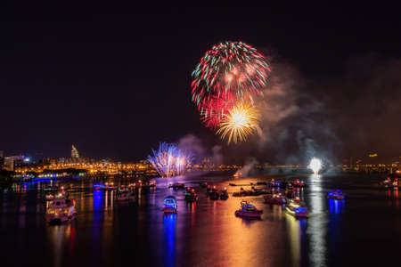 Colorful fireworks of various colors at night with celebration and anniversary concept