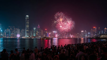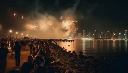 A vibrant display of fireworks lights up a city skyline at night, drawing a large crowd along the waterfront. The colorful reflections create a magical atmosphere.