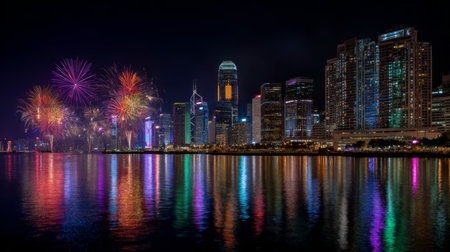A stunning urban skyline illuminated by vibrant fireworks at night, reflecting colorful lights on water. A perfect image for celebrations and festivals.