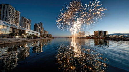 This stunning image captures a vibrant fireworks display over calm waters at dusk, showcasing an urban landscape with reflections that enhance the festive atmosphere.