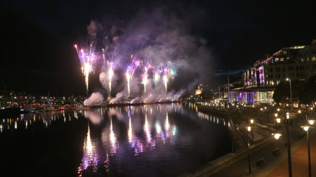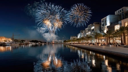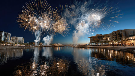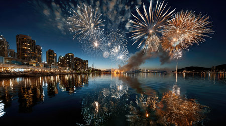 A breathtaking display of fireworks lights up the night sky, reflected in calm waters, creating a festive atmosphere perfect for events and celebrations in an urban setting.
