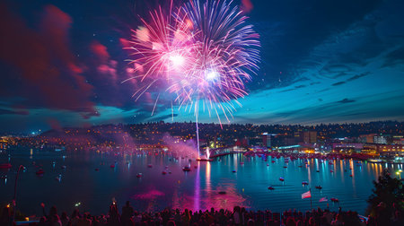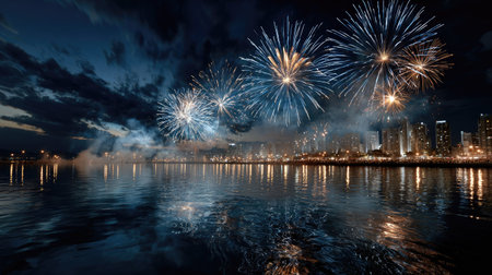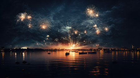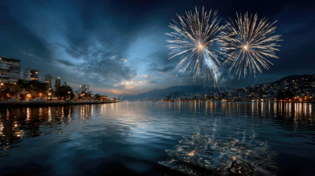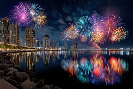 This captivating image showcases a vibrant fireworks display illuminating the night sky above a tranquil water body. The reflections create a mesmerizing scene against the city skyline.