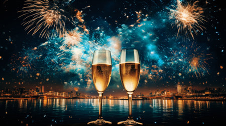 New Years celebration with fireworks and champagne glasses at night comeliness