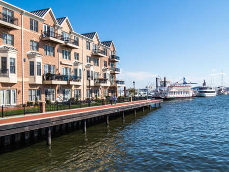 BALTIMORE-APRIL 23 - Luxury waterfront townhouses along the Baltimore Waterfront Promenade on April 23 2016 in Baltimore Maryland.