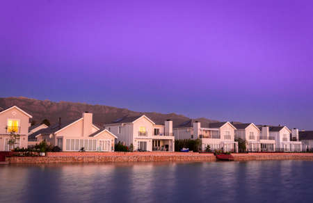 A row of houses surrounding a lake filled with reflections of the houses at sunrise, Val de Vie, Cape Town, South Africa