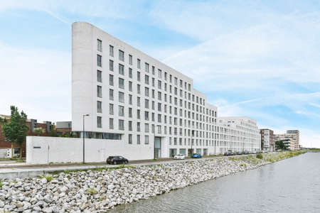 Vacation building in summer. Luxury waterfront house. Hotel building architecture. Private yacht dock. Modern building. Residential apartment in waterfront city. City waterfront with house