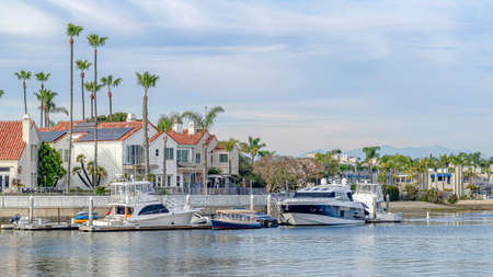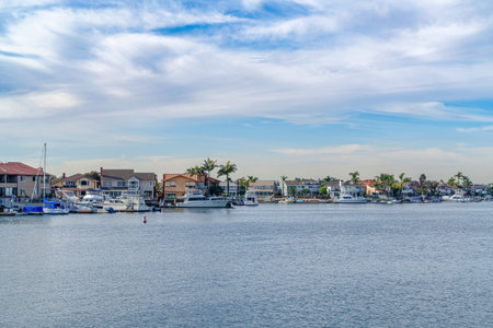 Scenic panoramic view of the sea with harbor and houses in Huntington Beach CA