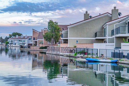 Sea and houses at a neighborhood in Huntington Beach California at sunset