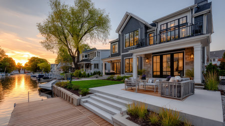 This photograph depicts a large house with multiple levels, featuring dark gray siding and white trim, alongside a serene lake. The composition showcases a modern aesthetic, with ample windows. Warm sunlight bathes the scene, creating a rich palette of colors. Potential uses include architectural publications or real estate promotion.