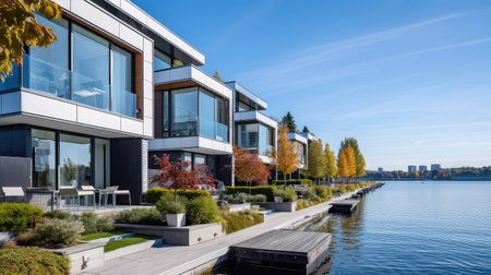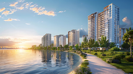 Captivating view of a modern apartment complex by the water, showcasing sleek architecture and stunning reflections during sunset, creating a serene urban atmosphere.