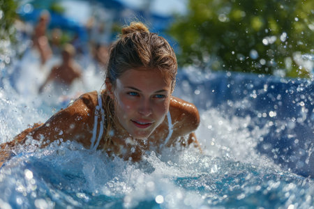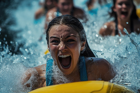 Joyful expressions fill the faces of young adults experiencing a fast-paced water ride, splashing water everywhere under the bright summer sun. Their cheers create an atmosphere of fun.