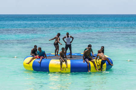 Ocho Rios, Jamaica - April 22, 2019: People are sitting and jumping on a water trampoline on the tropical Fisherman's Beach in the Caribbean island of Ocho Rios, Jamaica.