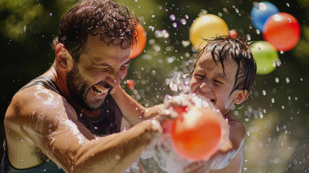 Two friends laugh and play in a summer water fight, enjoying the sunny day and splashing each other with water.