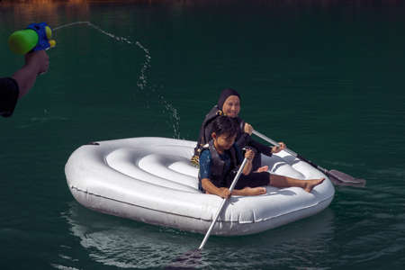 Family wearing life jackets paddling on an inflatable boat in Kenyir Lake, Malaysia.