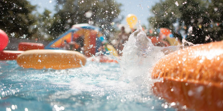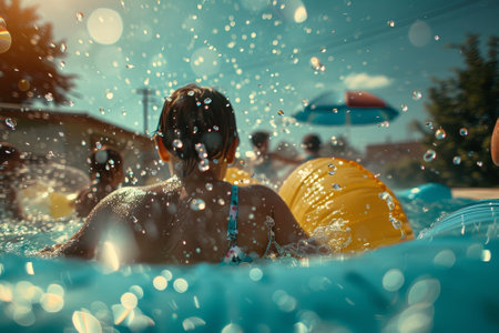 Children splash with pleasure and laughter in the pool in sunny summer weather