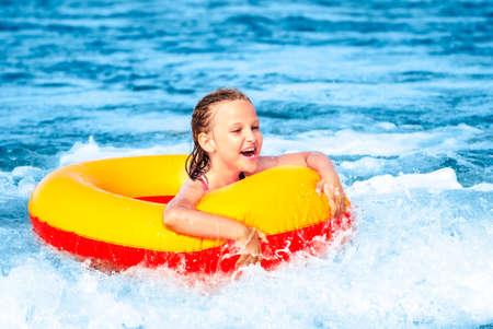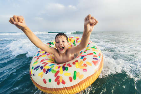 Joyful child on inflatable ring ride on breaking wave. Travel lifestyle, swimming activities. Selective focus