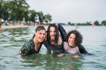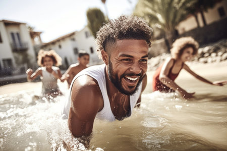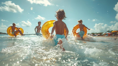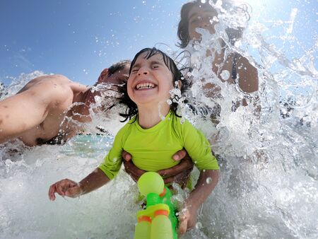Summer fun with a cheerful bathing family on the beach. Sea waves splashing bathers