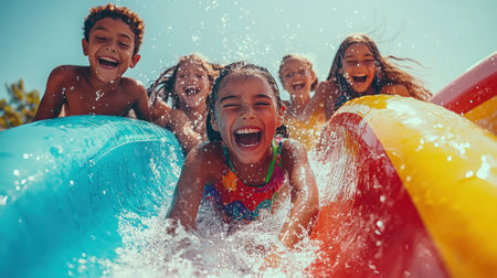 Five children laugh joyfully as they plunge down bright water slides on a sunny day, splashing in the pool below while making carefree memories.
