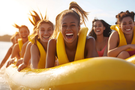 Happy young women wearing life jackets enjoying a fun summer day riding a banana boat on a lake