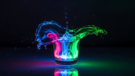 AI Generated. clear glass of water reflects colorful lights in creative studio setting