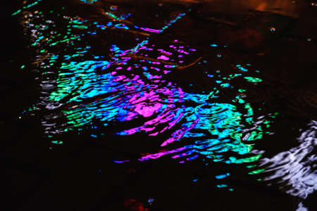 Multi-colored neon lights on a dark city street, reflection of neon light in puddles and water. Abstract night background, blurred bokeh light. Night view colorful