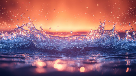 A stunning close-up of a water splash captured against a vivid sunset background. The vibrant orange and blue tones create a dramatic and refreshing scene.