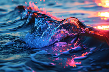 Close up of gentle ocean waves reflecting a stunningly colorful sunset. The waters surface glows with psychedelic shades of pink, teal, and gold, creating a serene and beautiful abstract background.
