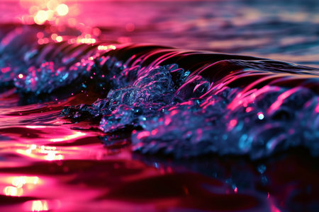 Aigenerated image depicting an abstract wavy liquid surface glowing with neon blue and pink lights bokeh effect creating a vibrant and dynamic visual. The texture is smooth with subtle ripples