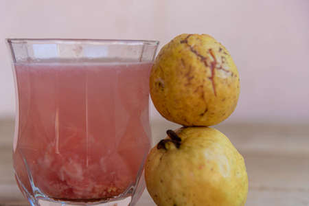 Glass with guava juice and fresh fruits on wooden background. Natural juice, detox and refreshing. Drink rich in fiber. Exotic drink rich in nutrients. Natural food.