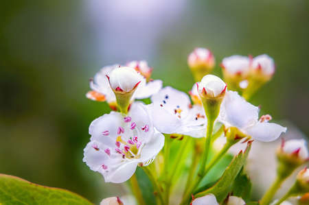 Blooming apple tree in the garden on a sunny spring day with blurred background. white flowers. beauty in nature. nature details. natural background. selective focus.
