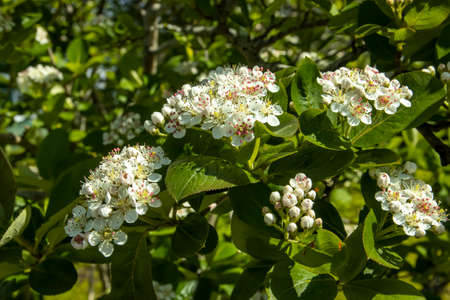 White flowers of a flowering Bush of black-fruited mountain ash in summer