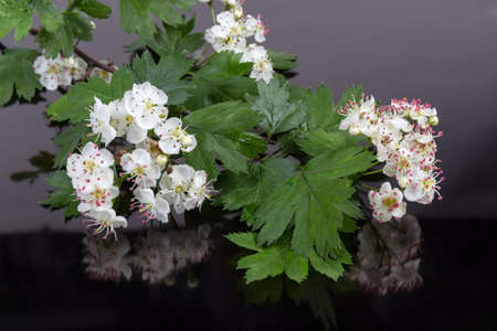 Small branch of the hawthorn with flowers, buds and green leaves above the dark reflective surface
