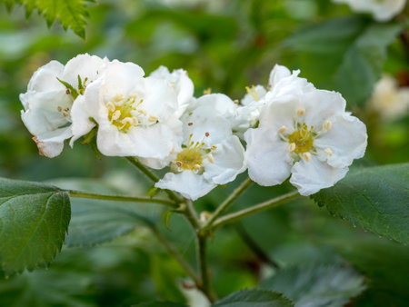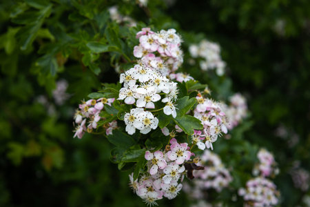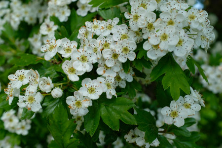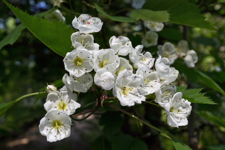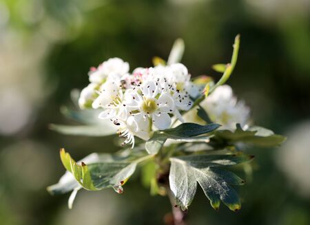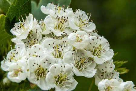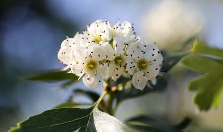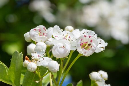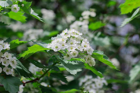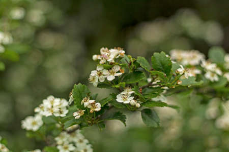 Hawthorn flowers (Crataegus monogyna) with selective focus. It is a well-known medicinal plant