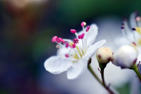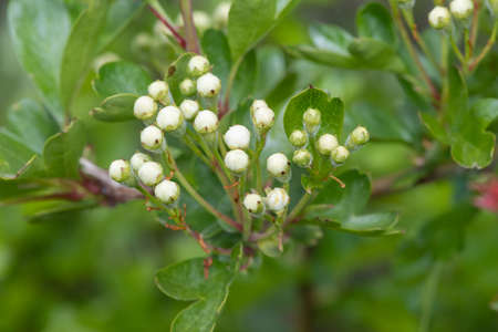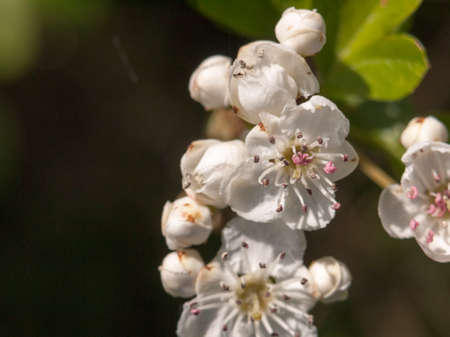 Macro of white flower and buds on maythorn (Crataegus monogyna) branch