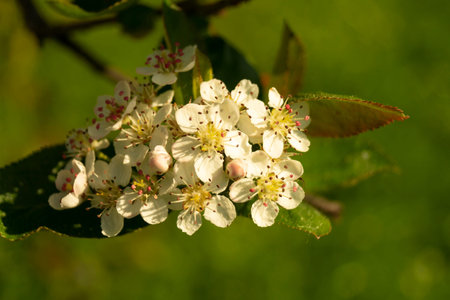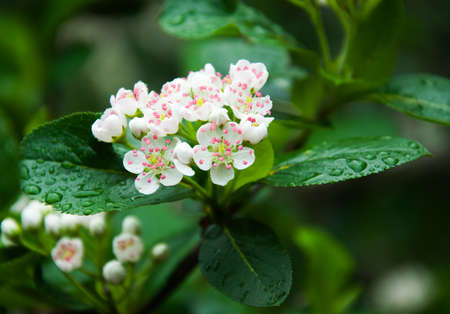 Chokeberry flowers and leaves. Spring macro photo.