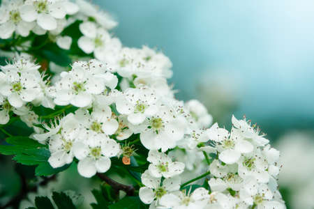 Beautiful blooming hawthorn tree in springtime. White flowers background