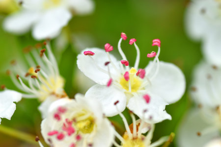 Common Hawthorn (Crataegus monogyna). Flower Closeup