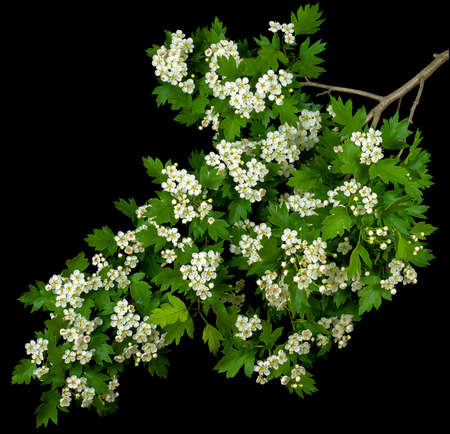 White flowers and green foliage of a large branch of a hawthorn tree in spring isolated on a black background, studio photo.